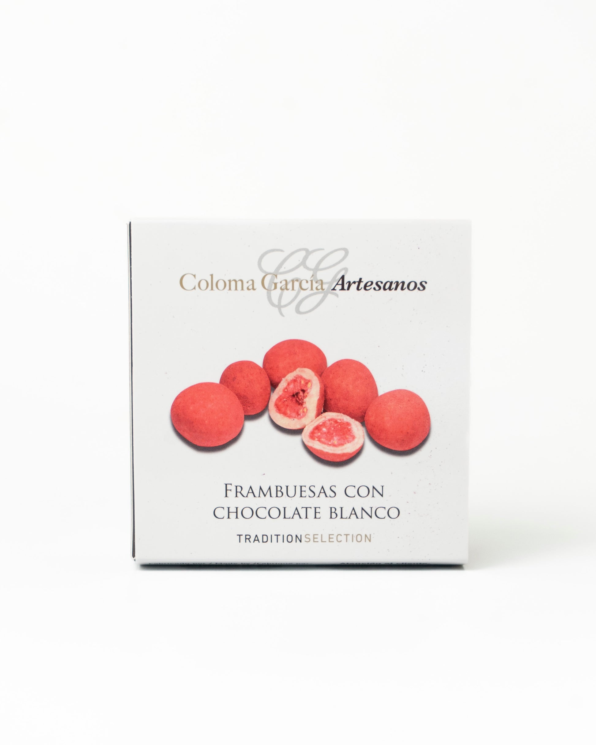 Las frambuesas al chocolate blanco de Coloma García, están compuestas por frambuesas enteras naturales liofilizadas, recubiertas de cobertura de chocolate blanco y yogur, con polvo de frambuesa espolvoreado. Hechas de manera artesanal en el obrador de Coloma García en Jijona. Al ser una empresa familiar, su prioridad es que la elaboración de sus productos sea con las mejores materias primas para ofrecer una calidad excepcional.