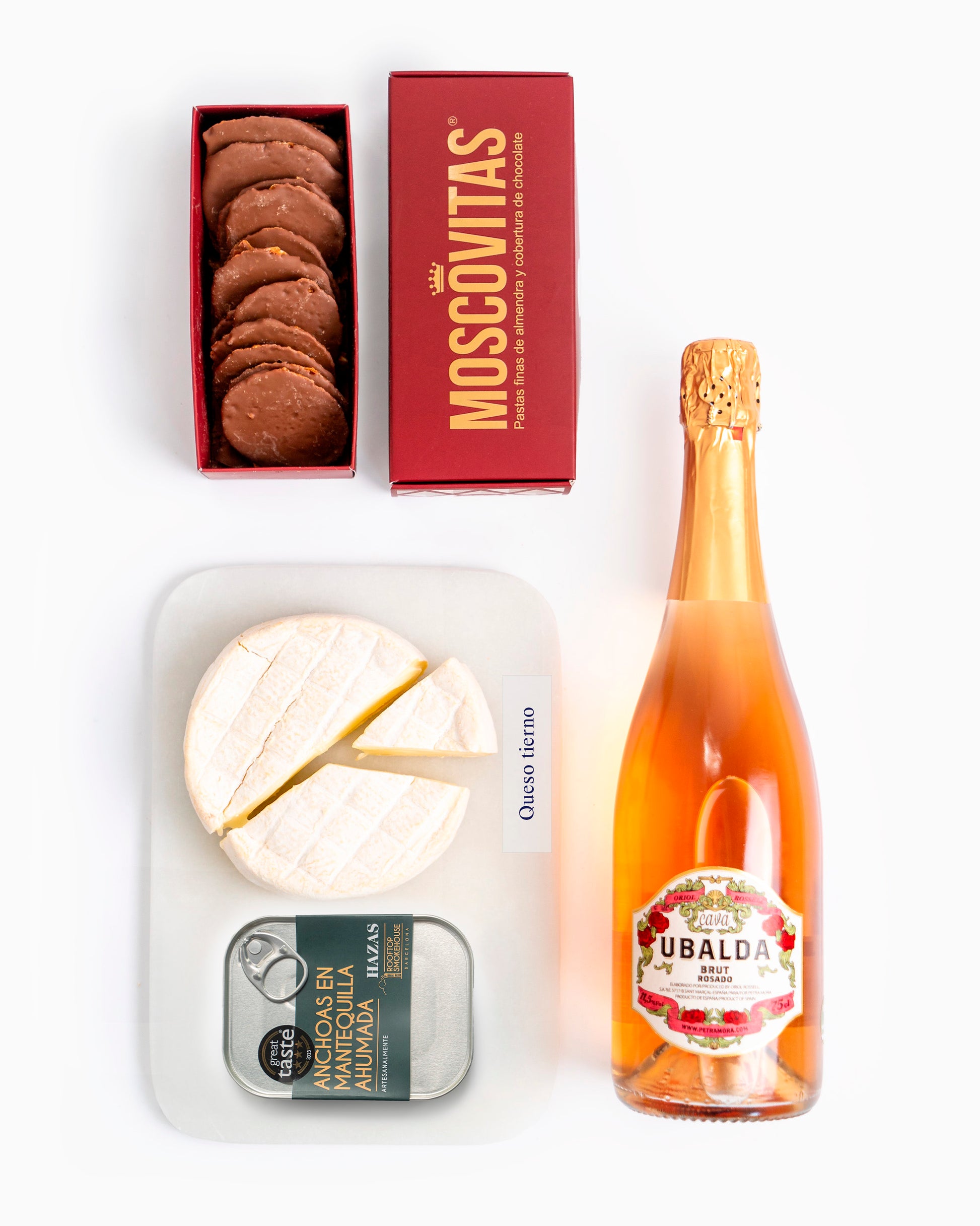 - 1 ud. de Cava brut rosado Ubalda Eco: Cava brut ecológico, elaborado con uva trepat. De burbuja fina, persistente, con aromas fuertes de frutas rojas y notas balsámicas que realzan su vivacidad.