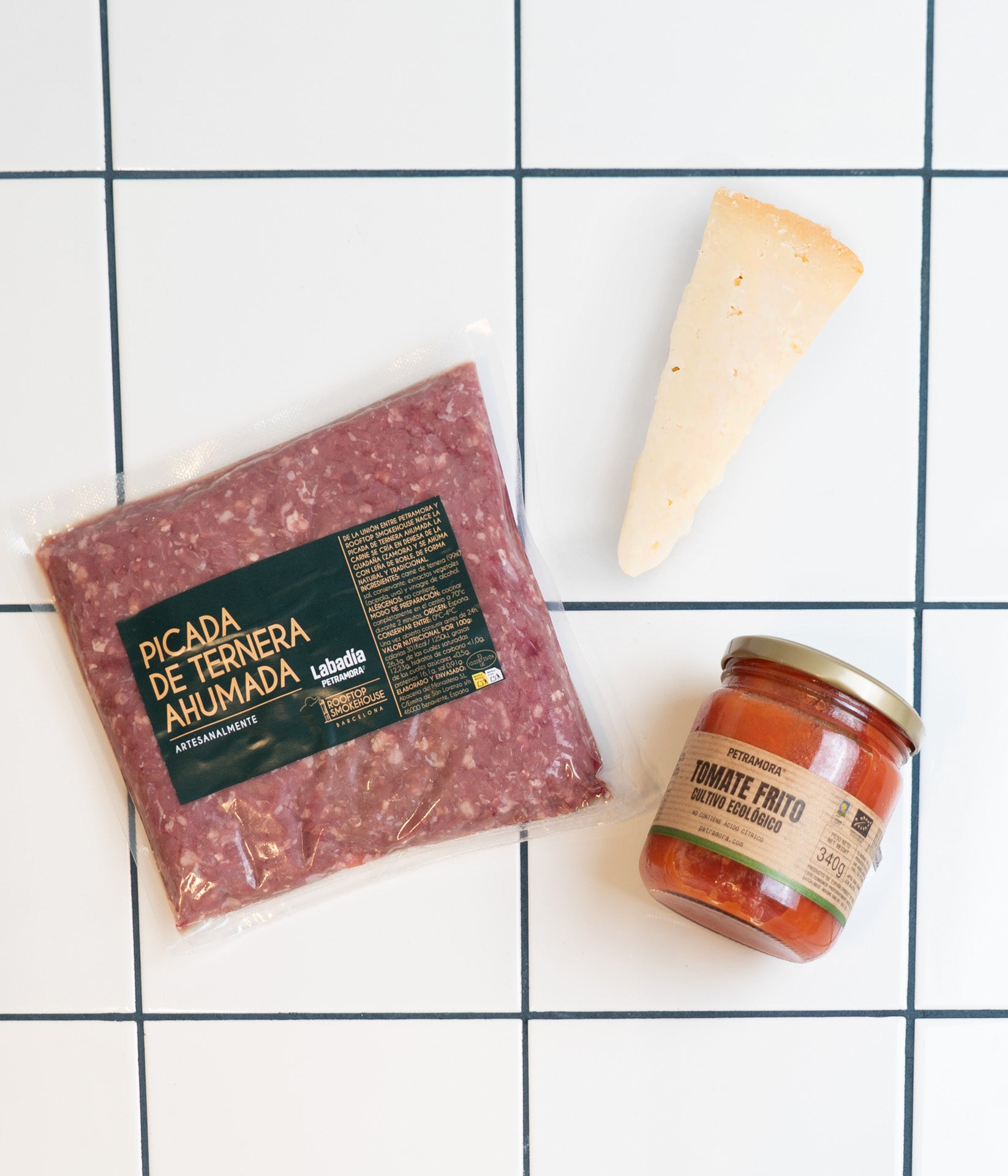 - 1 ud. de Picada de ternera ahumada 500 g: picada de nuestras terneras pardas de montaña ahumada de forma natural con madera de roble por Rooftop Smokehouse.