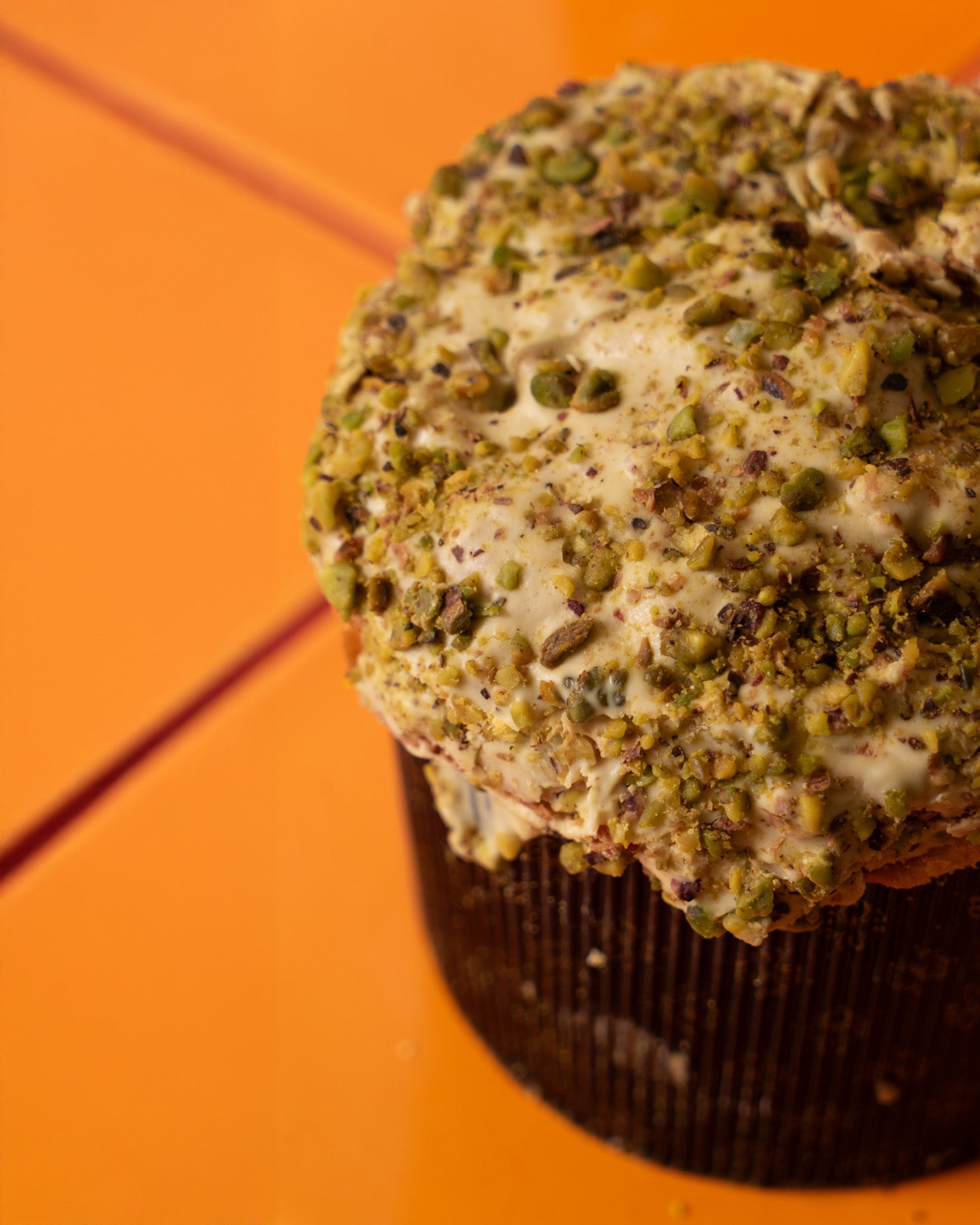 Elaborado con ingredientes naturales y siguiendo la receta original: con masa madre de cultivo a la que se le añade crema de pistacho y cobertura de chocolate blanco coronada con trozos de pistacho tostado.