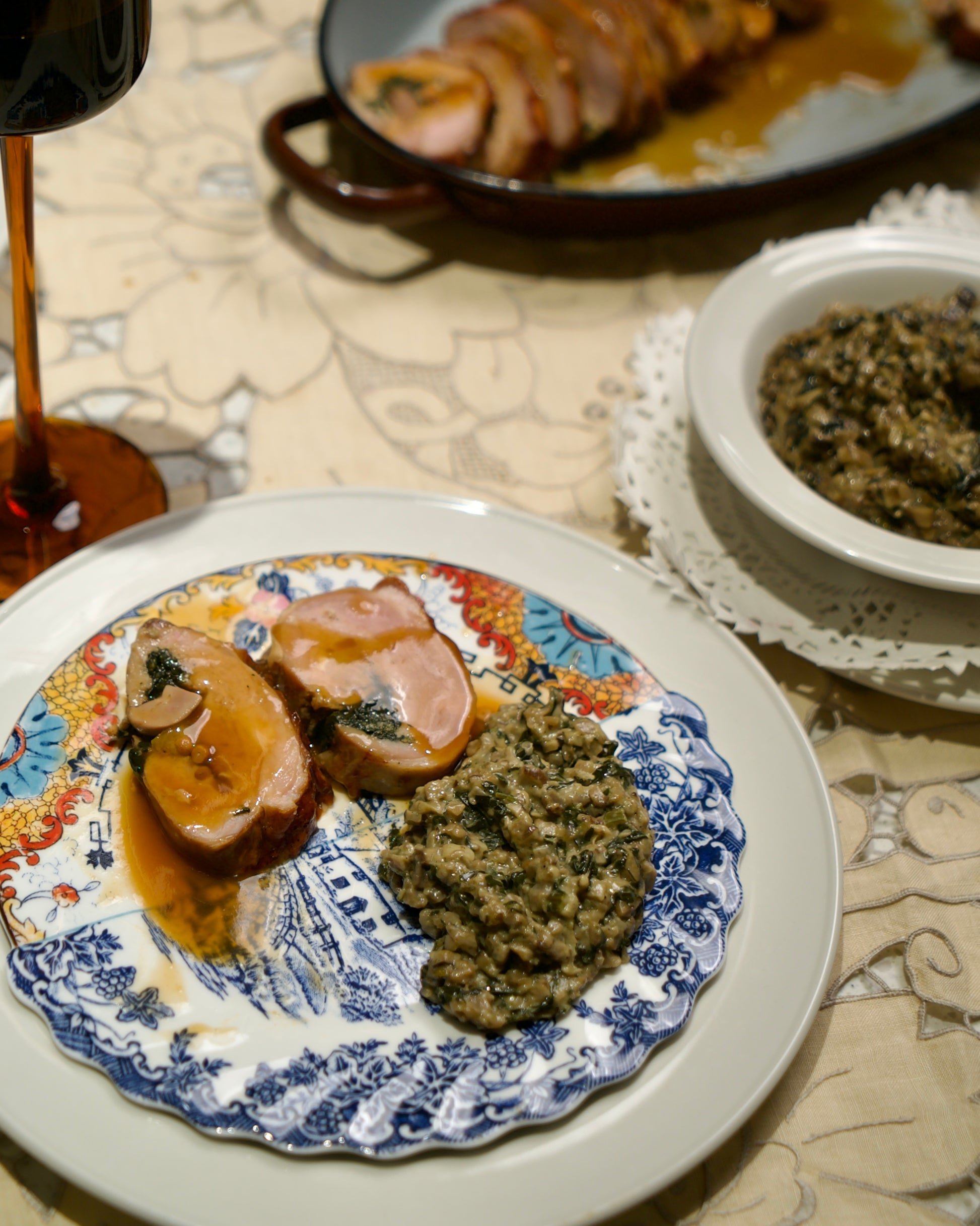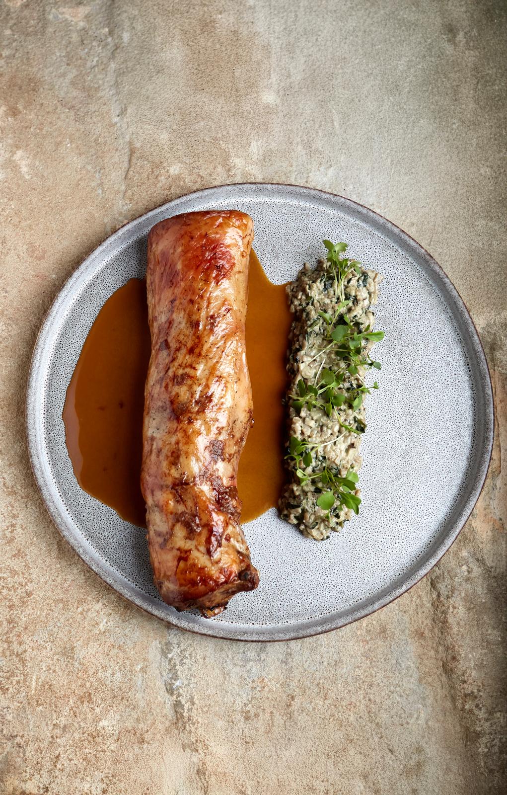 Pierna de Cordero Lechal Rellena de Hermanos Manzano asada y rellena de mollejas y riñones del propio lechal, espinacas, piñones y puerro. Un plato festivo para disfrutar en la mesa. Elaborada con corderos lechales de raza churra criados junto a sus madres en Dehesa La Guadaña (Labadía Petramora), se alimentan solo de leche materna, lo que hace que tengan una carne suave y muy jugosa.