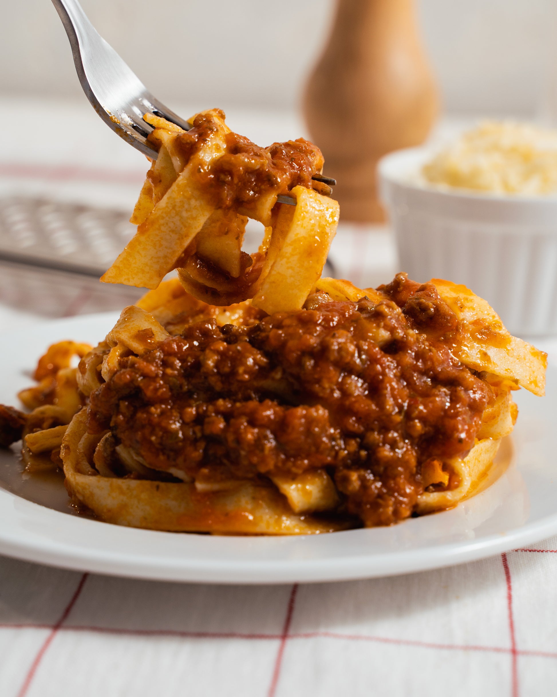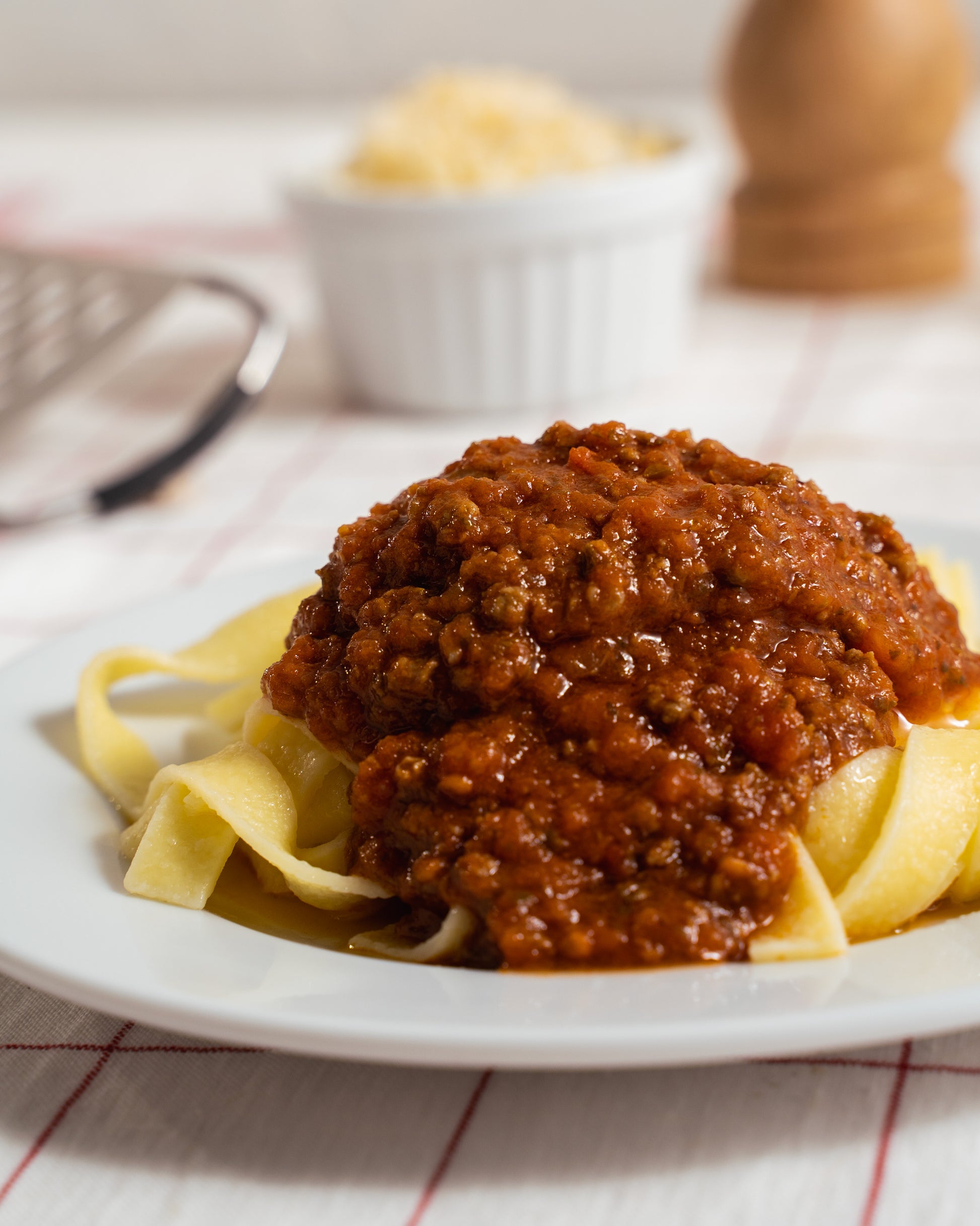 Salsa boloñesa elaborada con "su salsa de tomate", carne de ternera y aromatizada con hierbas.