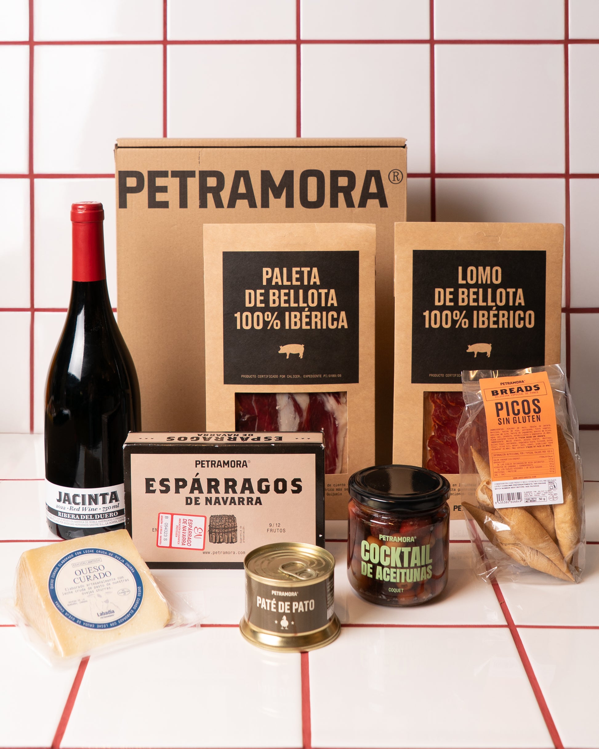 - 1 ud. Paleta de bellota 100% ibérica 70g: Paleta de bellota 100% ibérica loncheada, procedente de cerdos ibéricos de pura raza criados alimentados con botellas en extensivo en la Dehesa de Bolsiquillos (Badajoz) y curada en bodegas en Guijuelo.