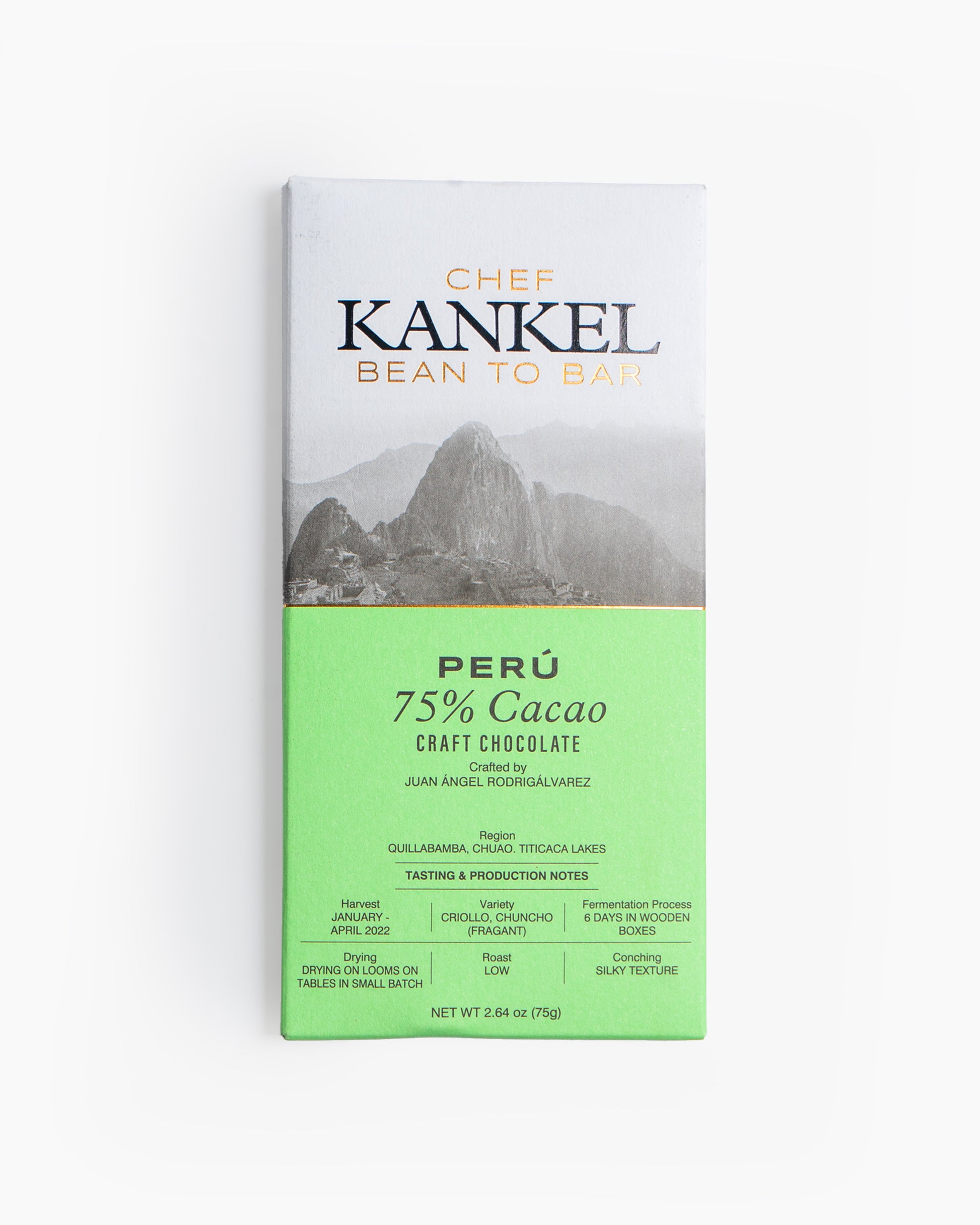 Chocolate 75% origen Perú con el ligero amargor y los tropicales toques ácidos que recuerdan a maracuyá y mandarina junto aromas de frutos secos y especias. Su color y marmolado son evidencias de su cultivo entre las cordilleras nevadas de Mountaln y la meseta del Titicaca, un paraje idílico entre 1300 y 1500 metros de altura y baja producción donde Raúl en su Chacra produce esta apreciada variedad, Chuncho. Los indígenas Matsiguengas aún hoy lo utilizan como moneda de intercambio comercial.