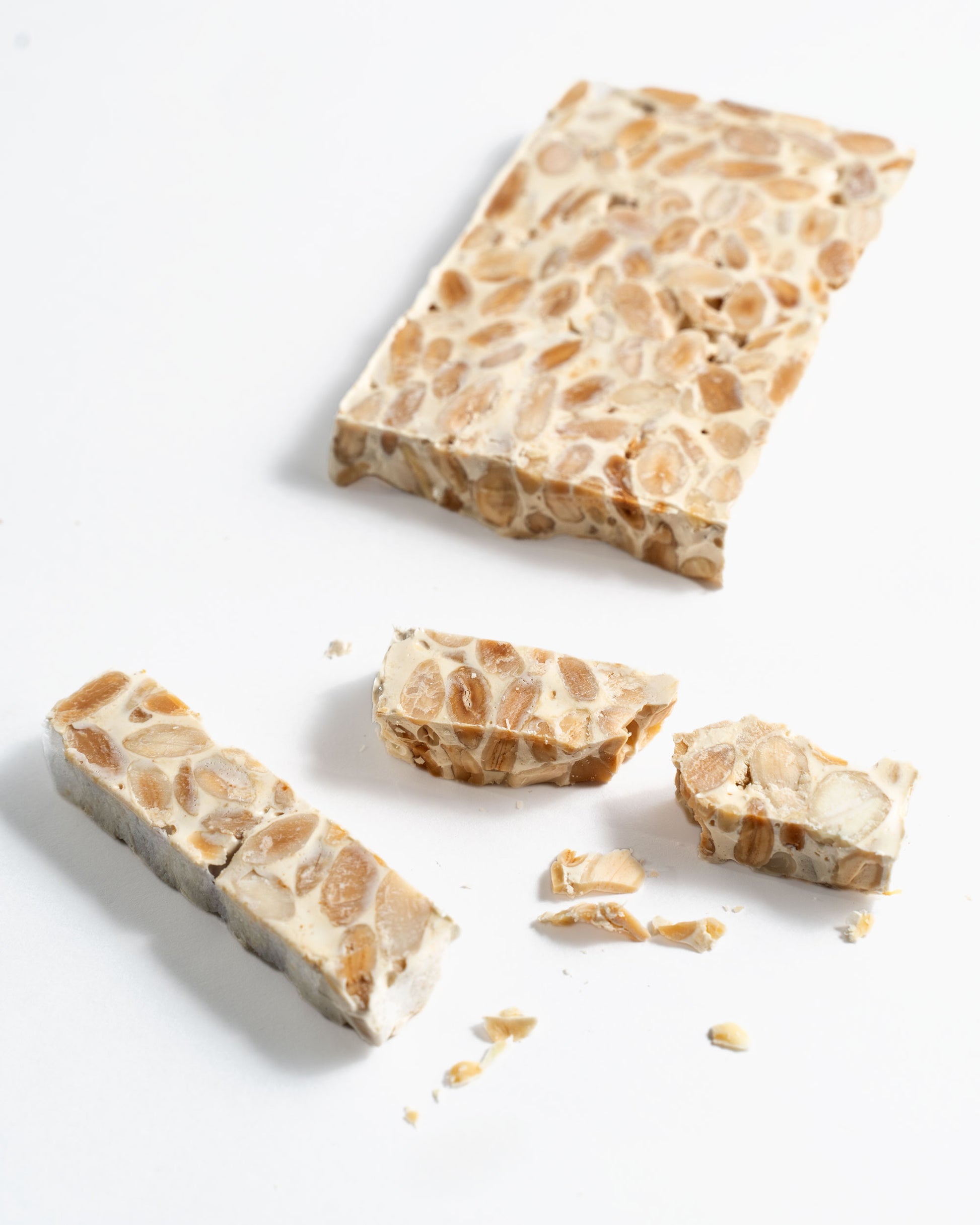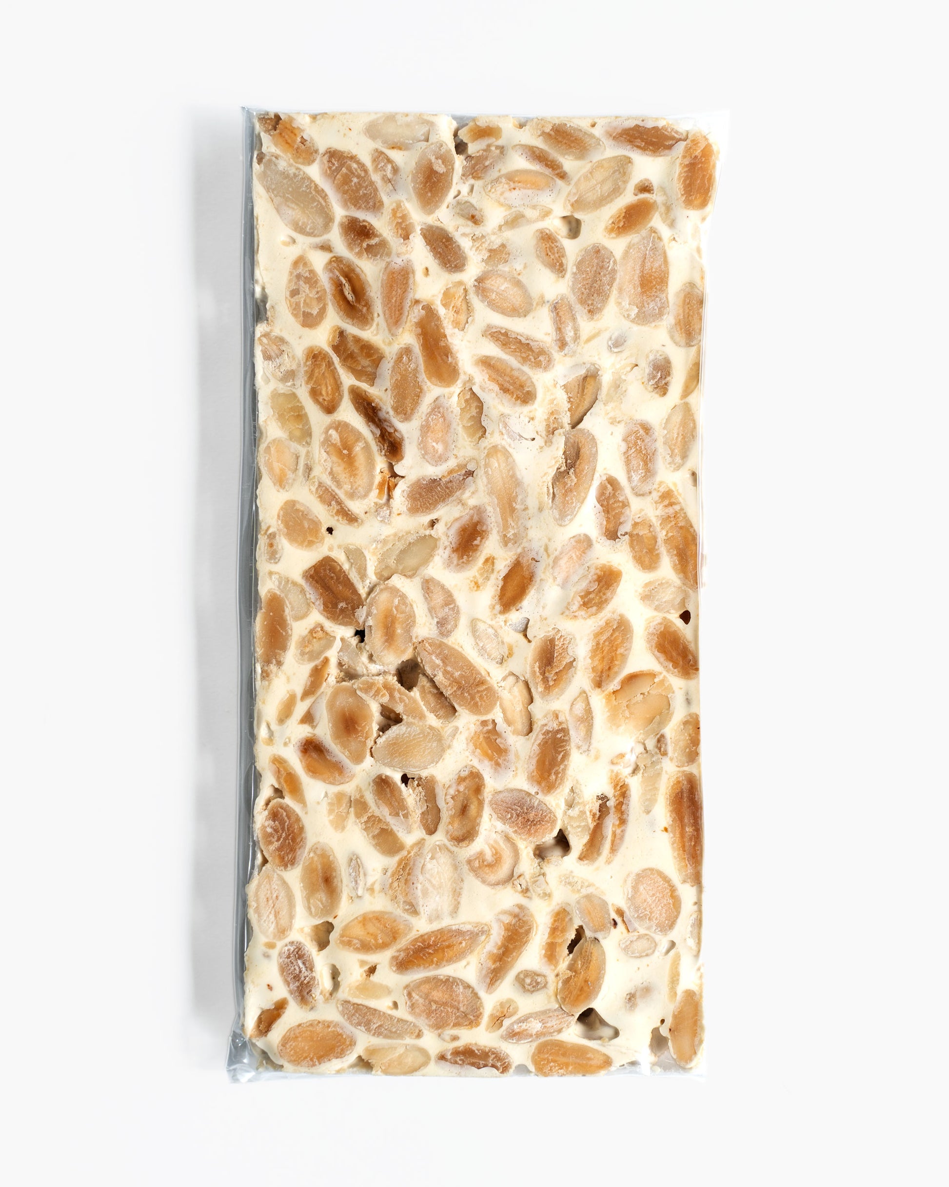 Turrón de Alicante de elaboración totalmente artesanal a partir de almendra marcona seleccionada y tostada, miel de azahar, huevo, azúcar y oblea.